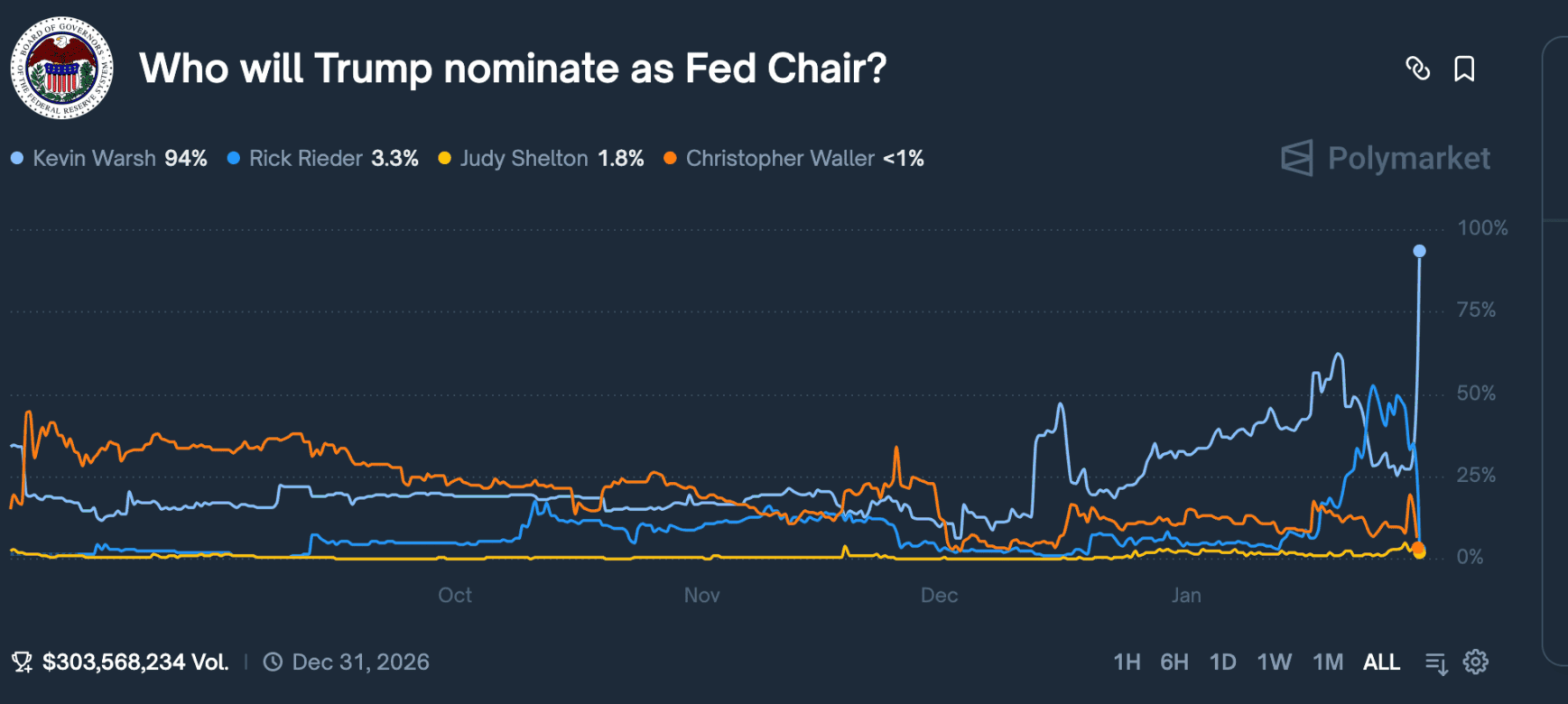 - Polymarket odds show Warsh’s chances surging above 94%.