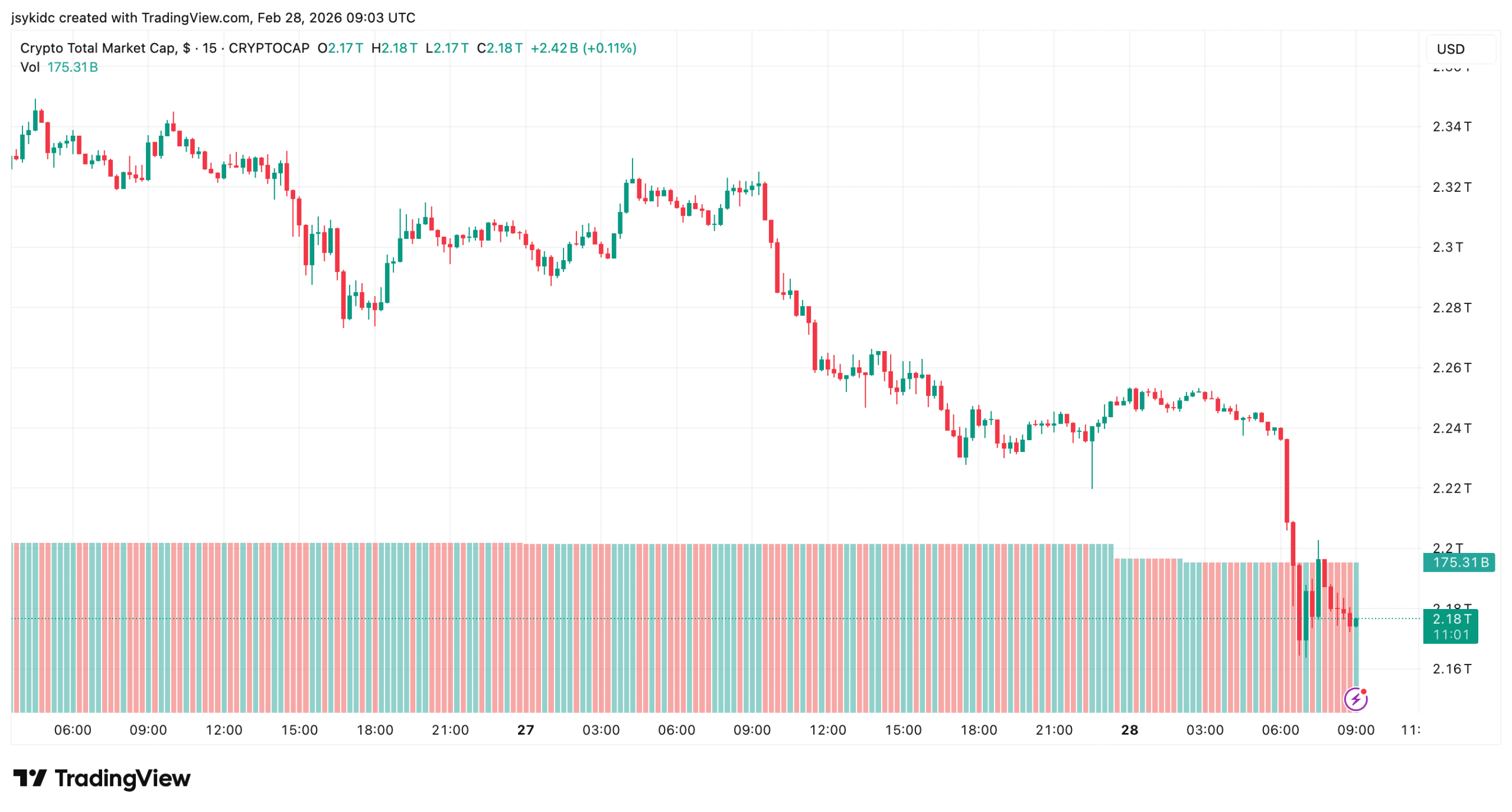 The market has experienced a sharp decline in value after the news of the strike by the US and Israeli missiles in Iran emerged. This has caused global uncertainty, resulting in an immediate sell-off in the market. The total market cap has decreased to $2.21 trillion, down by 5.49% in the past 24 hours.