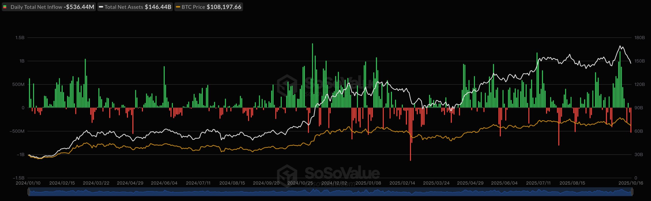 Additionally, on October 16, the U.S. spot Bitcoin ETFs collectively recorded net outflows totaling $536 million, according to SoSoValue data. It is also worth noting that none of the twelve BTC ETFs registered net inflows. This suggests investor caution amid recent market volatility. Spot Ethereum ETFs also posted a combined net outflow of $56.88 million for the day.