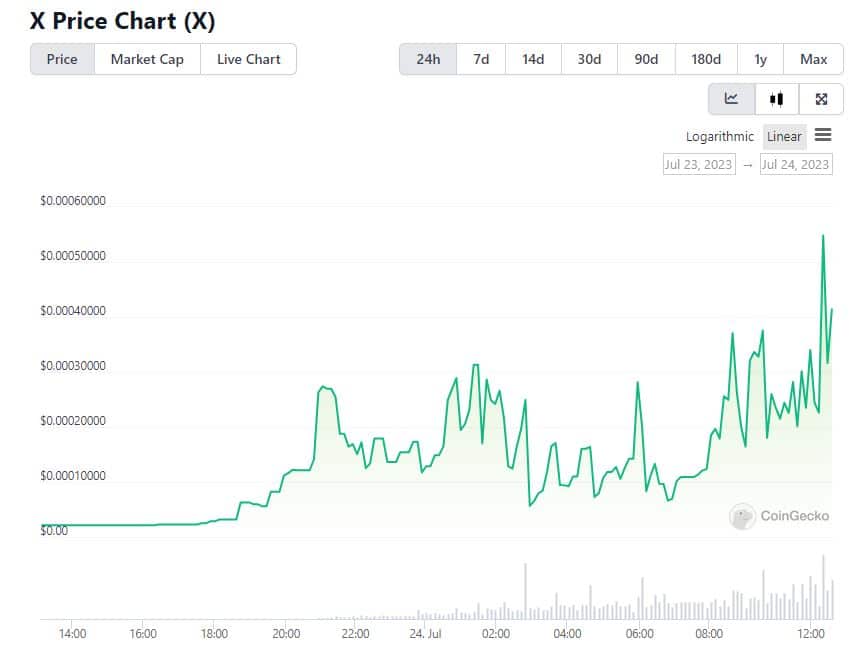 According to the Coingecko data, X token price jumped by more than 2000% over the past day, while its price has recorded a surge of 1,830% in the past 7 days. X token is trading at an average price of $0.000392, at the press time. Its 24 hours trading volume is up by 142,779% to stand at $133,491.